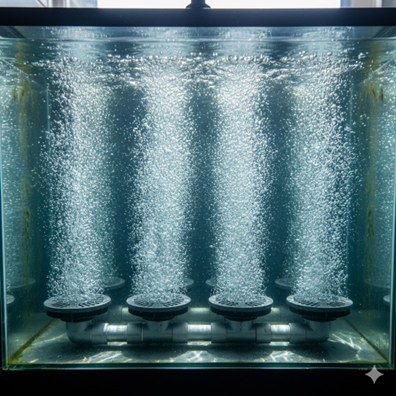Lợi ích: Bọt khí càng mịn, tổng diện tích bề mặt tiếp xúc giữa không khí và nước càng lớn. Điều này giúp oxy hòa tan vào nước (DO - Dissolved Oxygen) một cách hiệu quả và nhanh chóng hơn, cung cấp môi trường sống lý tưởng cho cá và vi sinh.