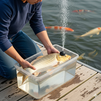- Cách khác (nếu không có sủi): Giữ cá gần mặt nước và nhẹ nhàng di chuyển cá tới lui. Hành động này cũng giúp tạo ra một dòng nước chảy qua mang. Tuy nhiên, cách dùng sủi oxy hiệu quả và ít tốn sức hơn.