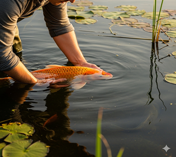 Vớt cá nhẹ nhàng: Dùng một chiếc vợt lớn, mềm hoặc dùng hai tay từ từ vớt cá lên khỏi mặt nước. Tuyệt đối không làm cá bị va đập hay trầy xước.