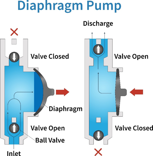 - Khi màng kéo ra sau: Không khí được hút vào buồng chứa qua van nạp.