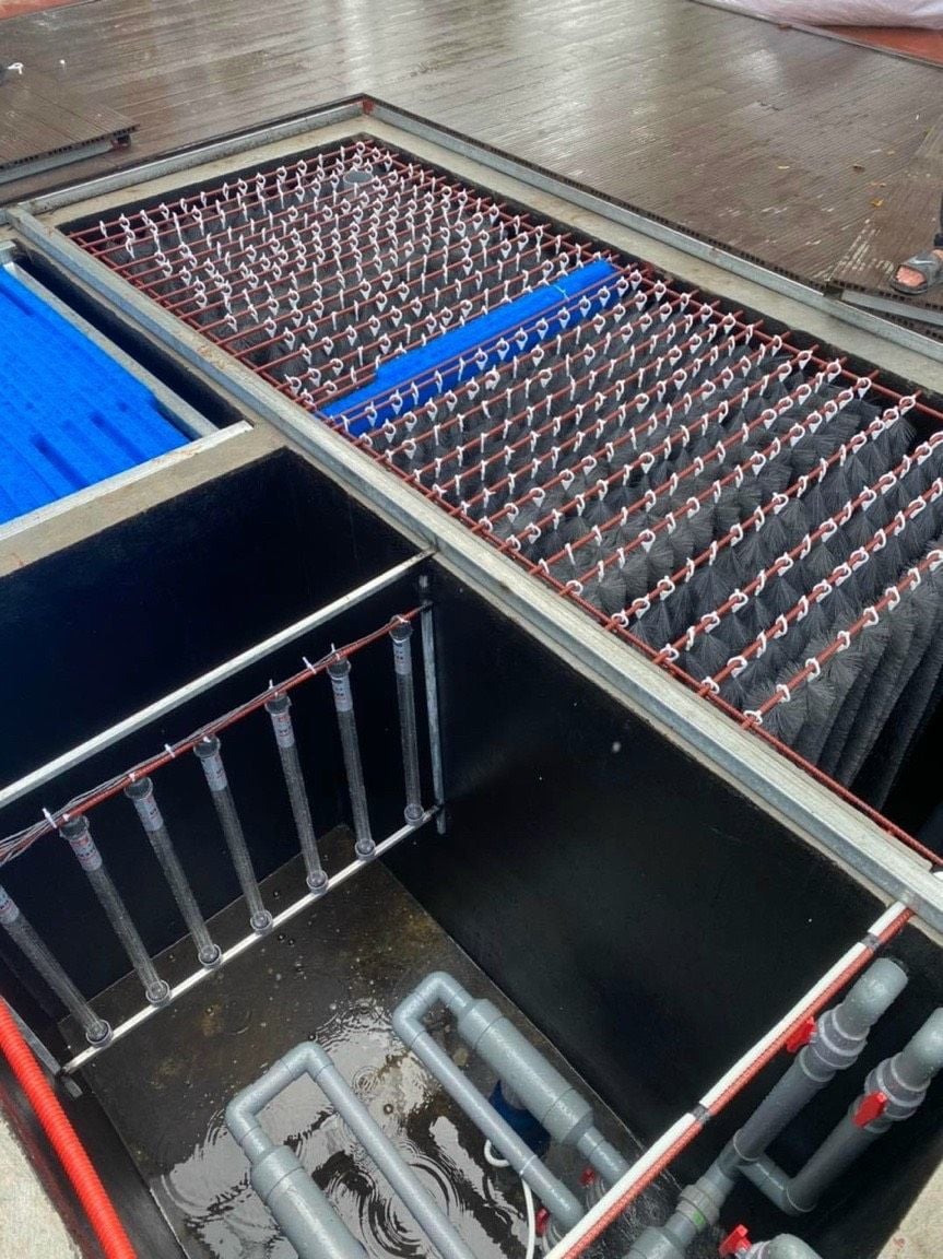 - Mỗi hồ cá đặc biệt là hồ Koi, đều có ngăn lọc riêng, chổi lọc được xếp ở ngăn đầu tiên (được gọi là ngăn lắng), chịu trách nhiệm xử lý nước từ hồ chính. Ở ngăn này, chổi lọc treo thẳng đứng, được xếp thành hàng ngay ngắn sát nhau, cố định trên thanh đỡ, cách bề mặt nắp ngăn lọc 10cm.