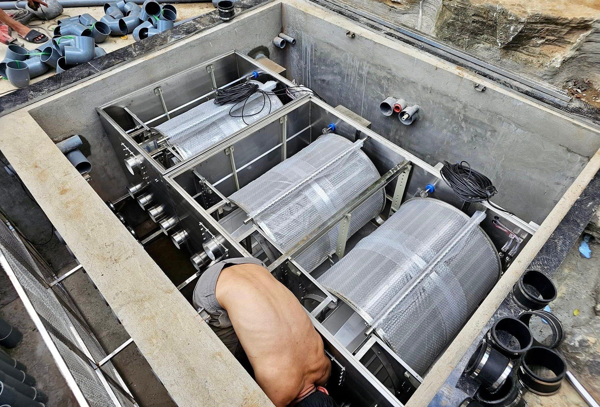 Tương tự đầu ra của Drum được kết nối đường ống đi vào các ngăn lọc vi sinh tiếp theo.